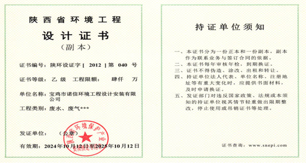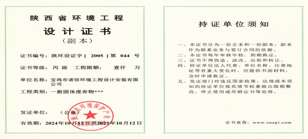 陜西省環(huán)境工程設(shè)計(jì)證書
