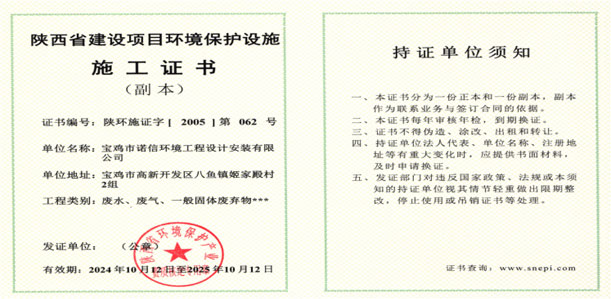 陜西省建設(shè)項(xiàng)目環(huán)境保護(hù)措施施工證書